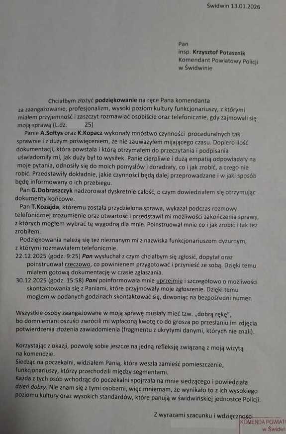 Wczoraj do naszej komendy wpłynęły podziękowania skierowane do policjantów naszej jednostki. To dla nas wyjątkowy sygnał, że codzienna służba jest dostrzegana i doceniana przez mieszkańców.