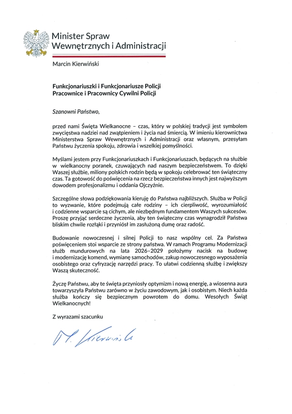 Minister Spraw Wewnętrznych i Administracji Marcin Kierwiński z okazji Świąt Wielkanocnych złożył życzenia wszystkim policjantkom, policjantom i pracownikom Policji.