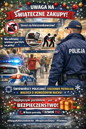 - Uwaga na świątecznych zakupach! Okres przedświąteczny to czas wzmożonych zakupów, pośpiechu i… niestety większej aktywności kieszonkowców. Apelujemy o zachowanie szczególnej ostrożności w sklepach, galeriach handlowych i na targowiskach.