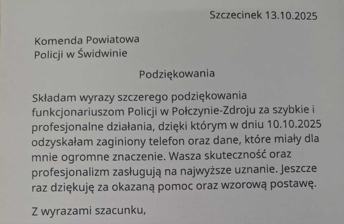 W ostatnich dniach do naszej jednostki trafiły wyjątkowe podziękowania od mieszkanki Szczecinka, która padła ofiarą kradzieży telefonu komórkowego. Dla wielu z nas telefon to dziś nie tylko urządzenie, ale codzienne narzędzie kontaktu z bliskimi, praca, wspomnienia i poczucie bezpieczeństwa. Nic więc dziwnego, że utrata takiego przedmiotu wywołuje ogromny stres i bezradność.