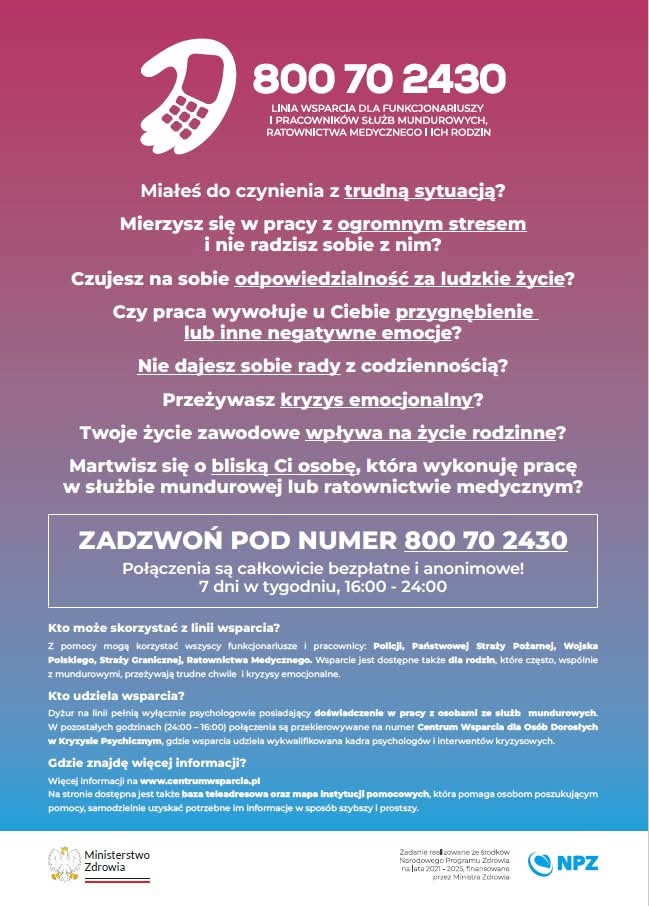 Jeśli zmagasz się z trudnymi emocjami, czujesz, że sytuacja Cię przerasta lub po prostu masz gorszy czas — nie zostawaj z tym sam. Zadzwoń na Linię Wsparcia dla Funkcjonariuszy i Pracowników Służb Mundurowych. Rozmowy są całkowicie bezpłatne i anonimowe.