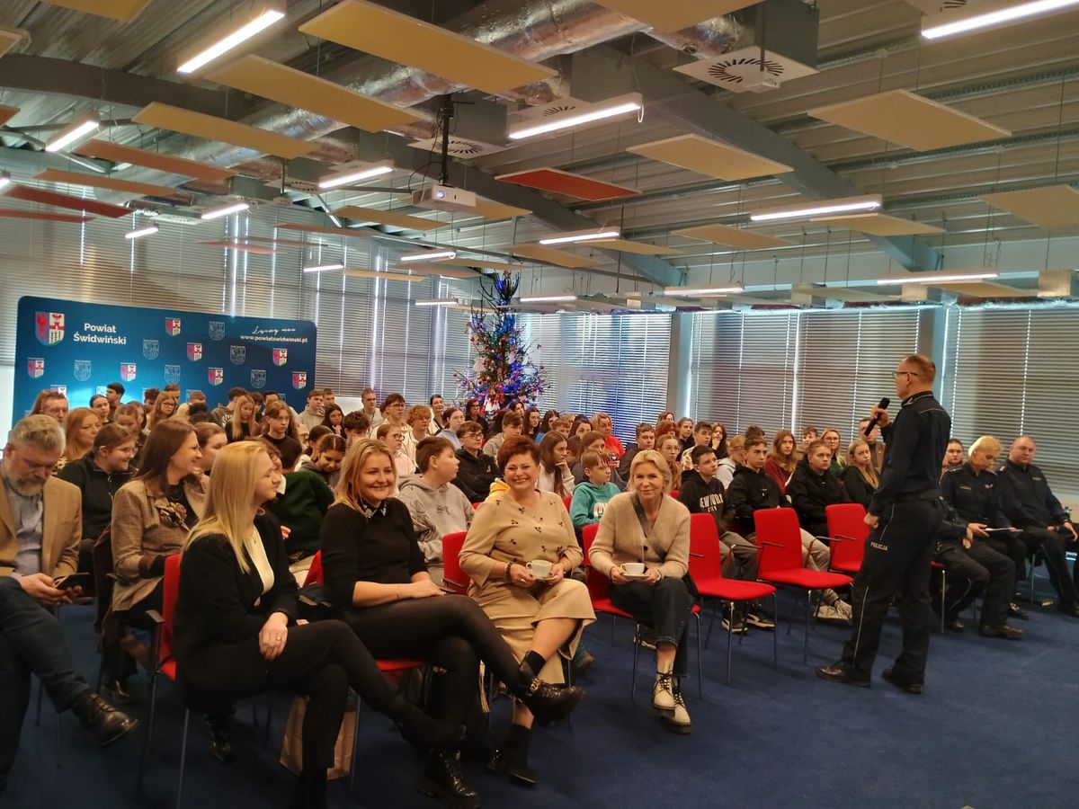 Dnia 16.12.2025 roku Komenda Powiatowego Policji w Świdwinie zaprosiła przedstawicieli szkół wraz z młodzieżą i instytucji: "Młodzieżowy Ośrodek Wychowawczy" w Rzepczynie oraz Poradnia Psychologiczno-Pedagogiczna w Świdwinie na Debatę Społeczną inicjującą, która odbyła się w sali konferencyjnej Centrum Nauki Cordis w Świdwinie.