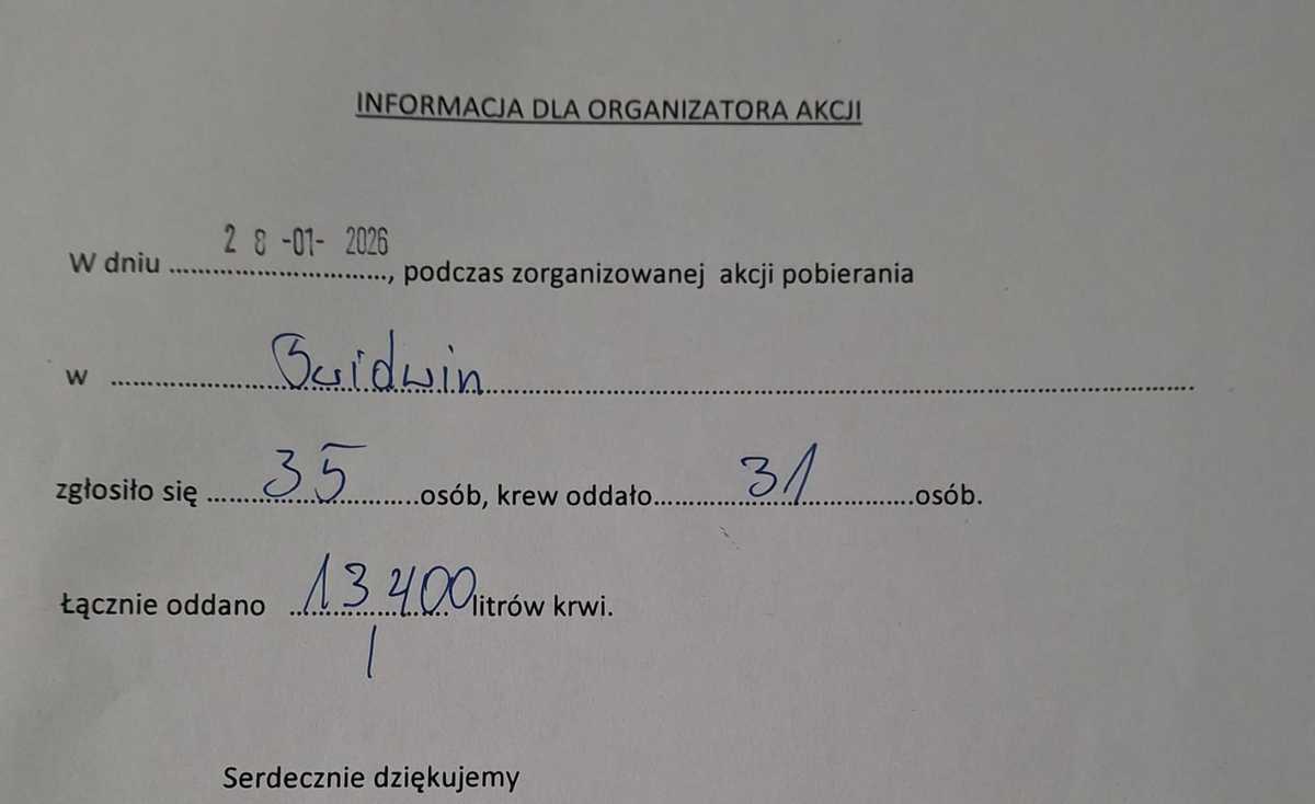 Dzięki wspólnemu zaangażowaniu udało się zebrać ponad 13 litrów krwi, która już wkrótce trafi do osób potrzebujących i pomoże ratować zdrowie oraz życie. Każda kropla to szansa, nadzieja i dowód solidarności mieszkańców naszego miasta. Już dziś zapraszamy na kolejną akcję, która odbędzie się 31 marca. Mamy nadzieję, że ponownie spotkamy się w tak licznym gronie i wspólnie pokażemy, jak wielką moc ma pomaganie. Podziękowania kierujemy również do Urzędu Miasta Świdwin za udostępnienie komfortowego i bezpiecznego miejsca do wypełniania niezbędnych formularzy oraz zapewnienie ciepłej herbaty, która pozwoliła naszym krwiodawcom chwilę odpocząć i nabrać sił przed oddaniem krwi. Takie wsparcie organizacyjne ma ogromne znaczenie i realnie wpływa na sprawny przebieg całej akcji.