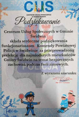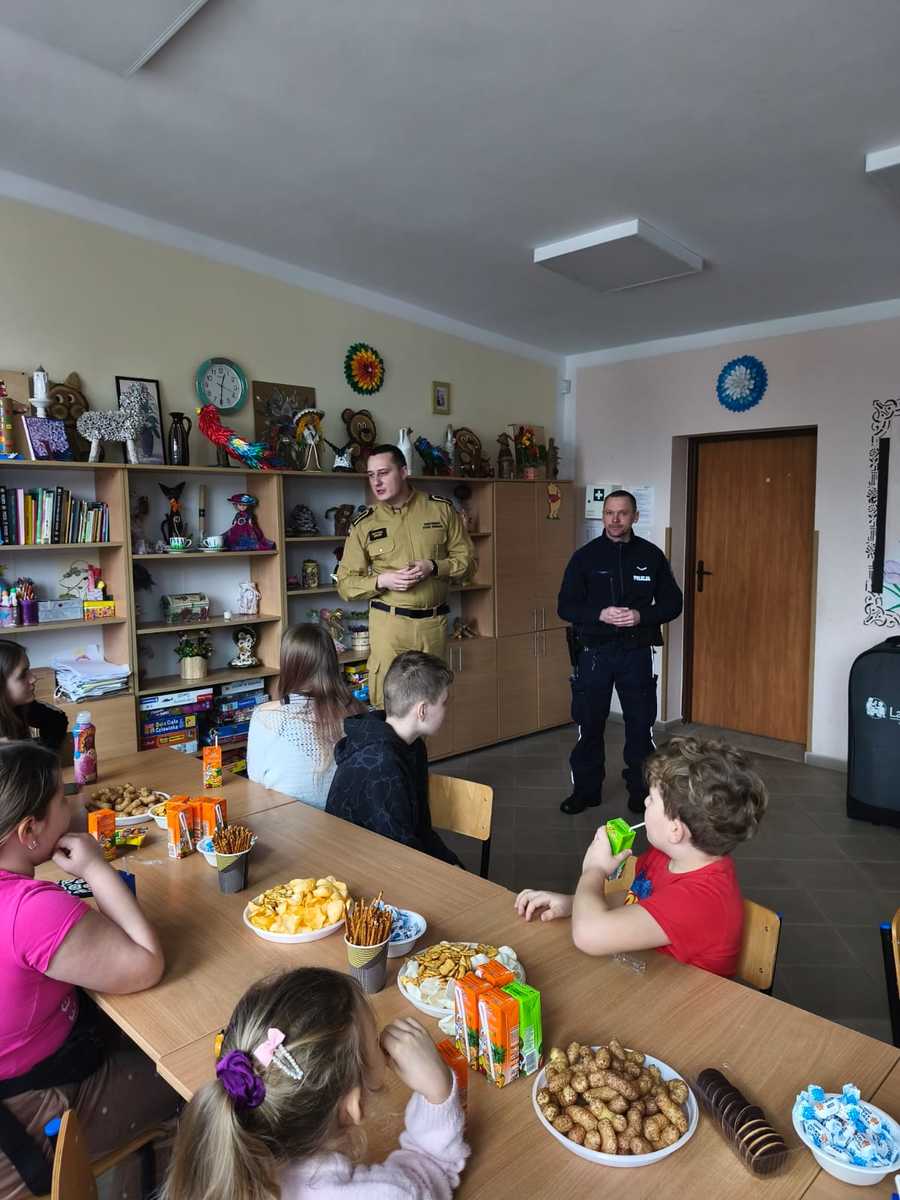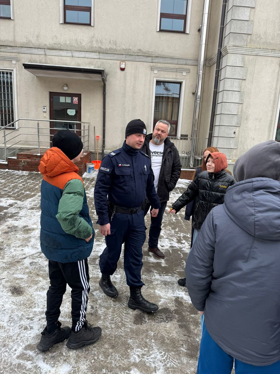 Omówiono m.in.: bezpiecznych zabawach na śniegu i lodzie, bezpieczeństwie w ruchu drogowym, bezpieczeństwie w internecie. Tematy te omawiał dzielnicowy, który wyjaśniał dzieciom, jak unikać zagrożeń i właściwie reagować w niebezpiecznych sytuacjach. W Lekowie i Klępczewie towarzyszyły nam również przedstawicielki Centrum Usług Społecznych w Gminie Świdwin, którym serdecznie dziękujemy za wspólne działania na rzecz bezpieczeństwa najmłodszych. Dodatkowo Komisariat Policji w Połczyn-Zdrój odwiedziły dzieci z Placówki Opiekuńczo - Wychowawczej w Połczynie - Zdroju. Podczas wizyty mogły zobaczyć, jak wygląda codzienna praca policjantów, obejrzeć z bliska radiowóz oraz poznać zasady bezpiecznego spędzania czasu w trakcie ferii zimowych. W Połczynie-Zdroju również dzielnicowy rozmawiał z dziećmi o bezpieczeństwie i odpowiadał na ich pytania.