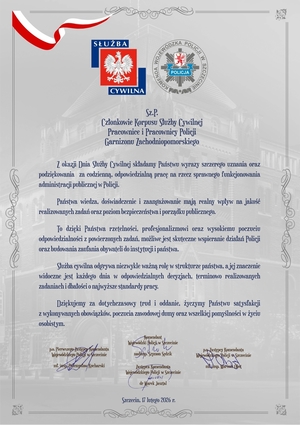 Z okazji Święta Służby Cywilnej przypadającego 17 lutego, Komendant Główny Policji gen. insp. Marek Boroń, w imieniu swoim i kierownictwa Policji, złożył na ręce członków Korpusu Służby Cywilnej, Pracownic i Pracowników Policji życzenia i słowa podziękowania.