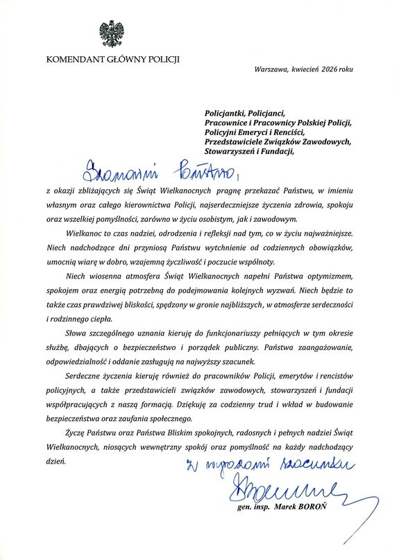 Komendant Główny Policji gen. insp. Marek Boroń w imieniu własnym oraz kierownictwa polskiej Policji zwraca się do policjantów, policjantek, pracowników cywilnych, emerytów i rencistów policyjnych oraz przedstawicieli związków zawodowych oraz organizacji pozarządowych przekazując życzenia z okazji Świąt Wielkanocnych.